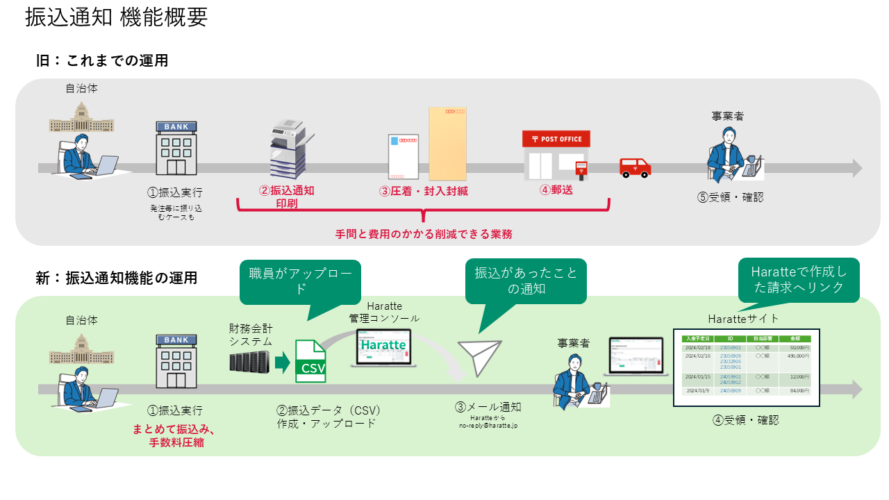 通知の仕組み: 自治体の財務会計システムから抽出した振込データを「Haratte」サイトにアップロードするだけで、「Haratte」に登録されている事業者へ振込内容が自動で通知されます。
